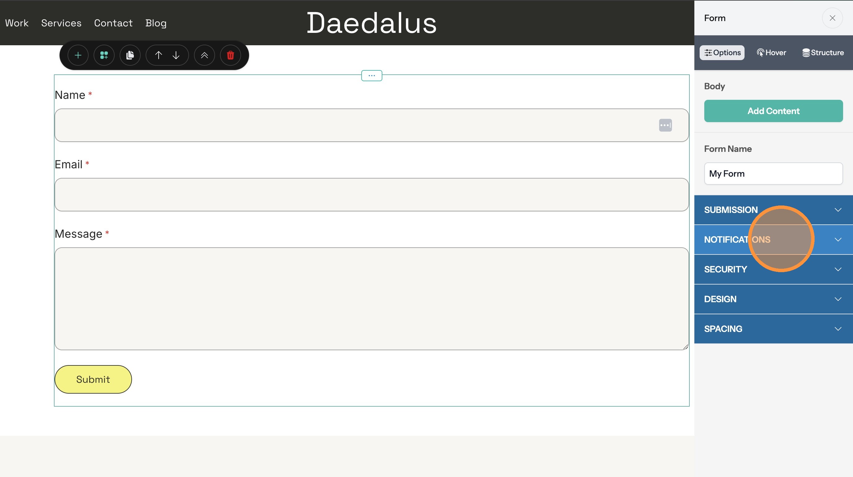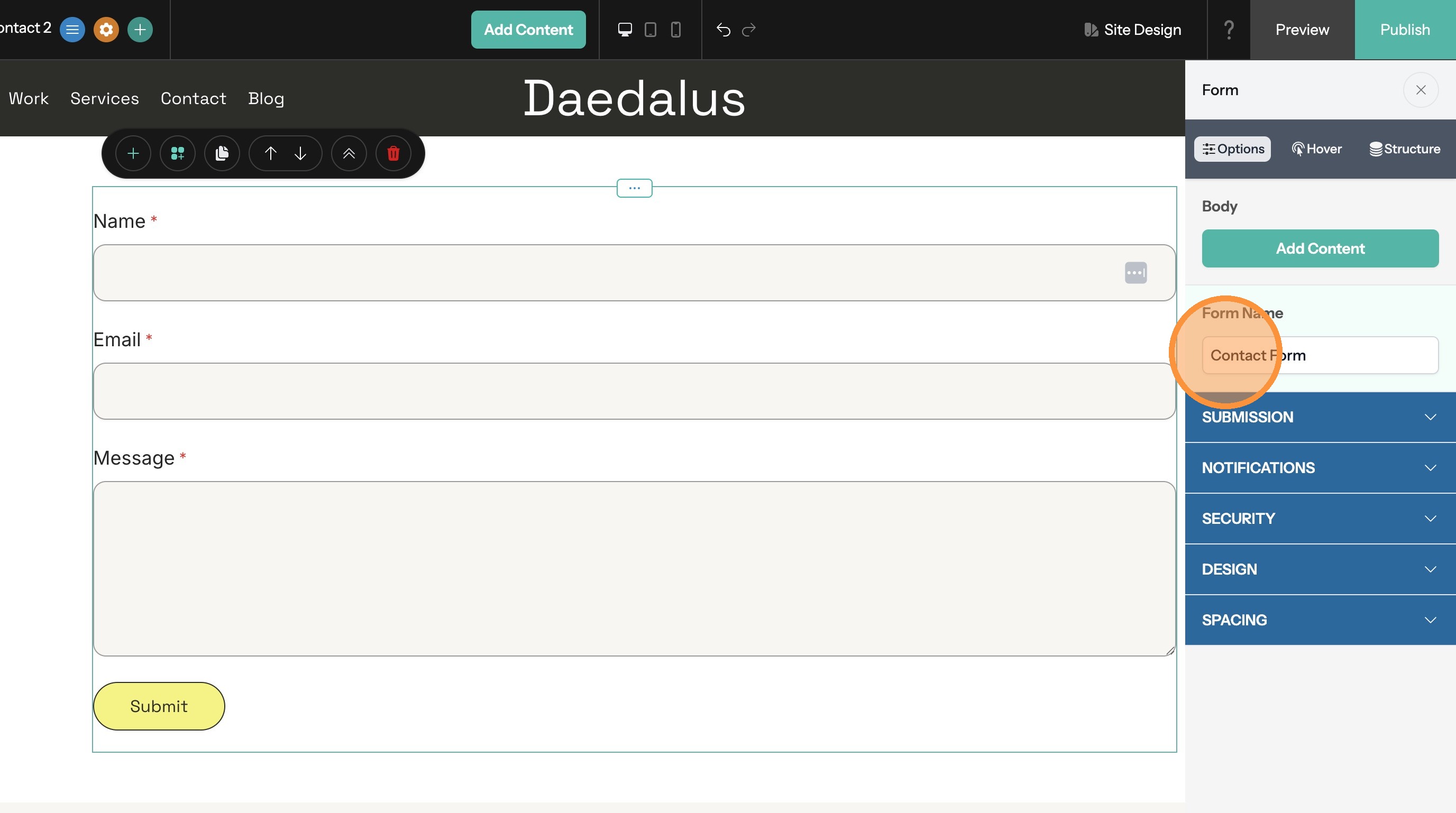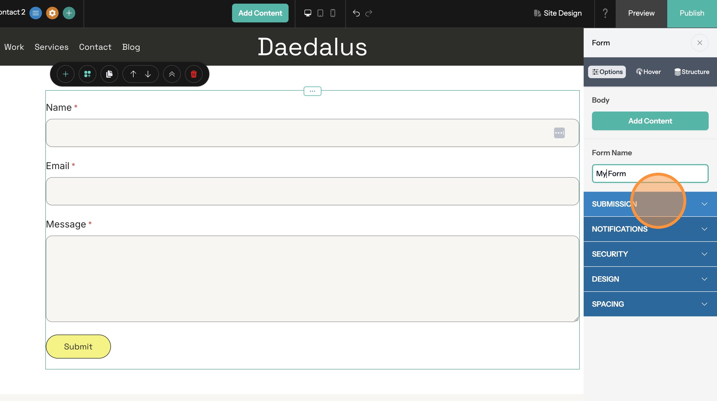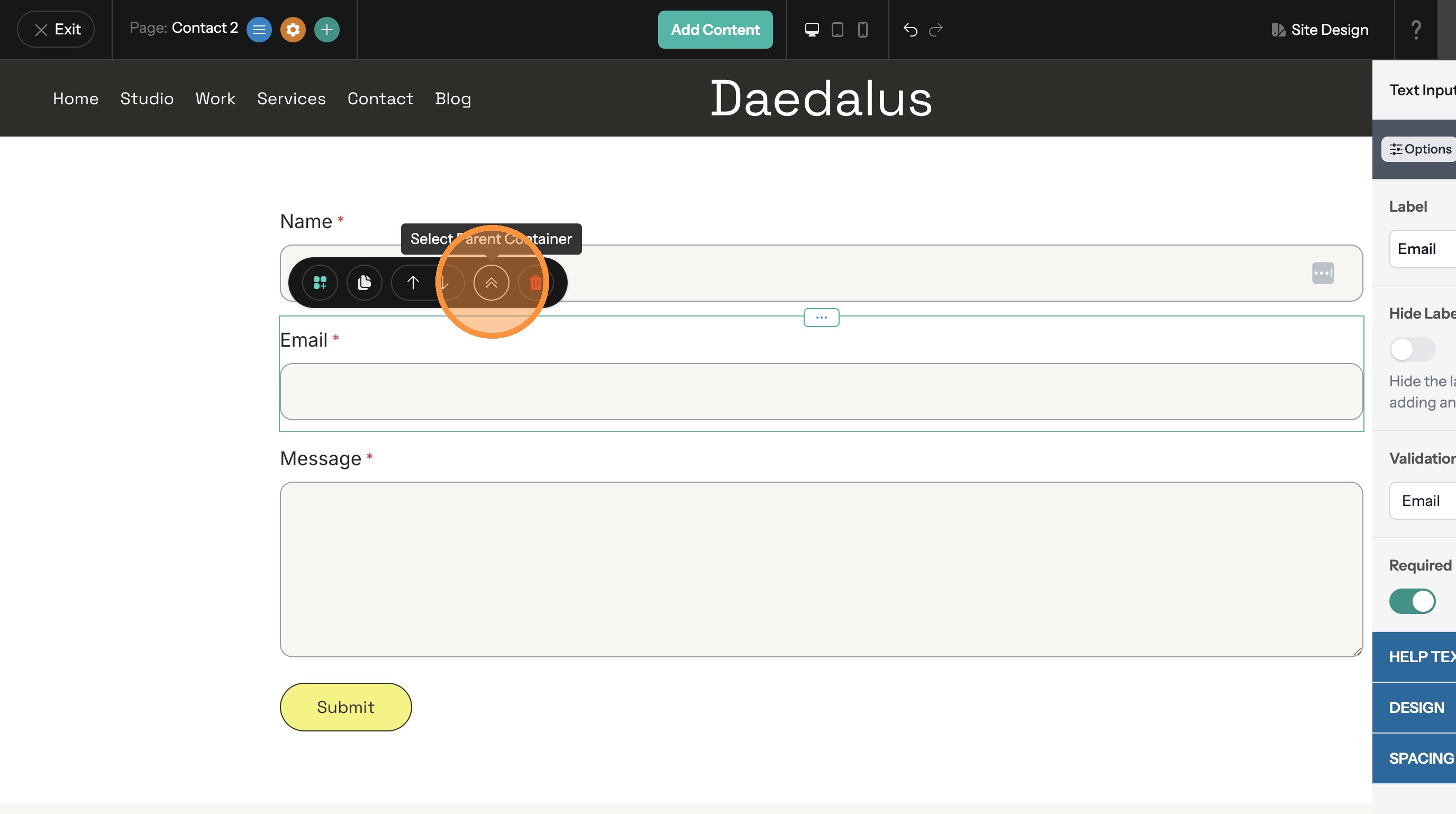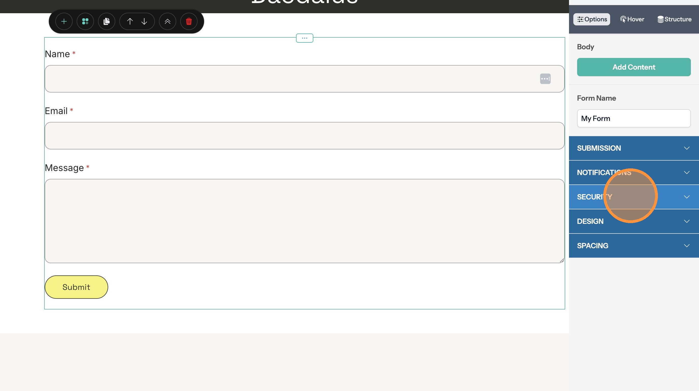 7. Click the Select Parent Container button in the toolbar. This selects the form and opens the options panel.