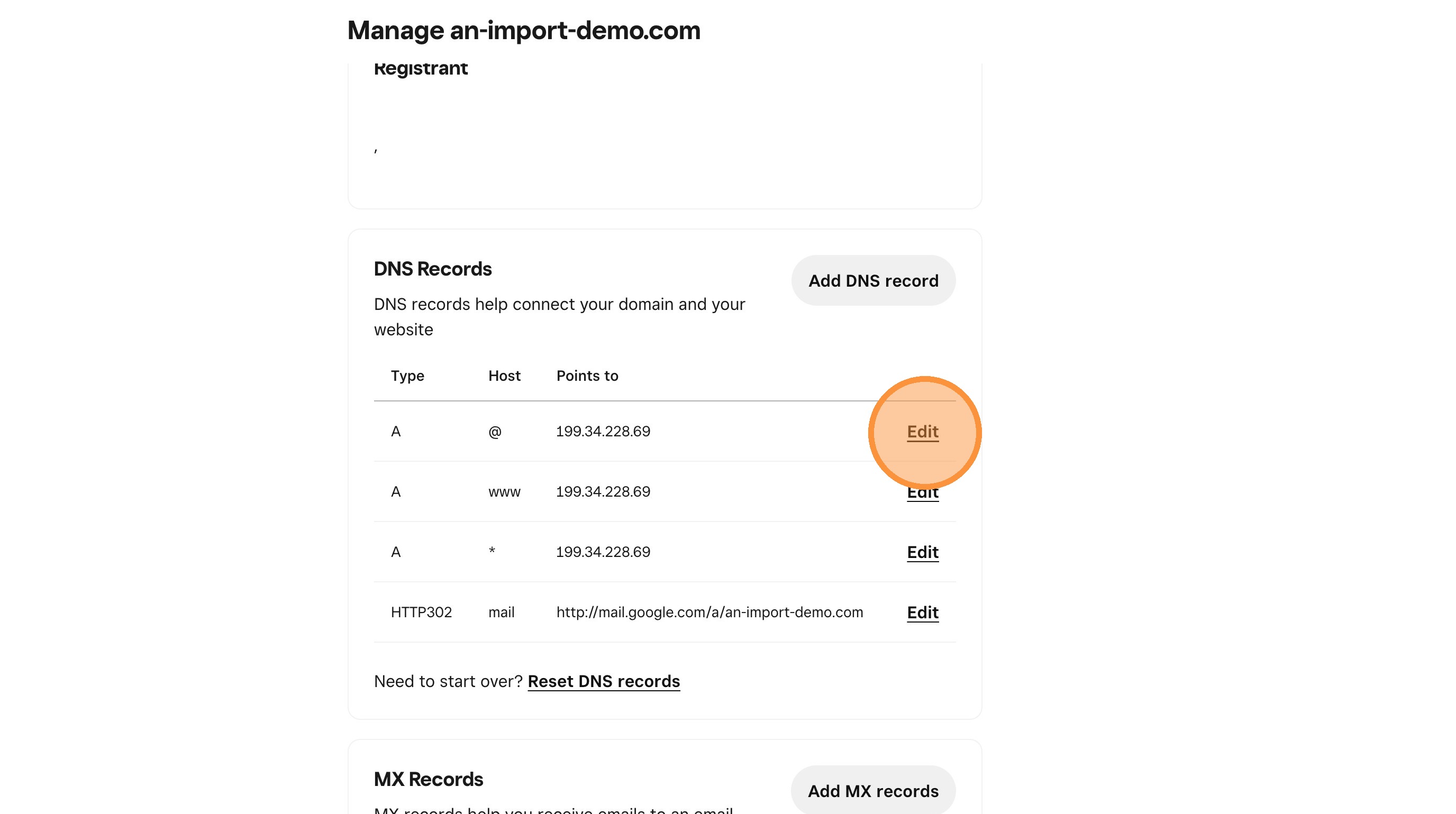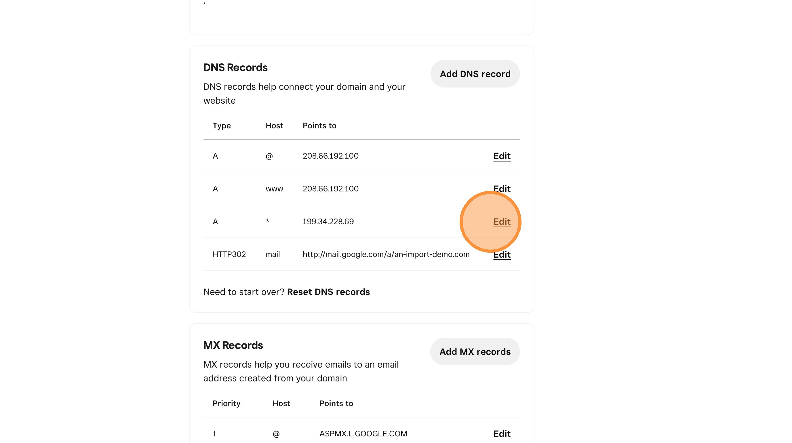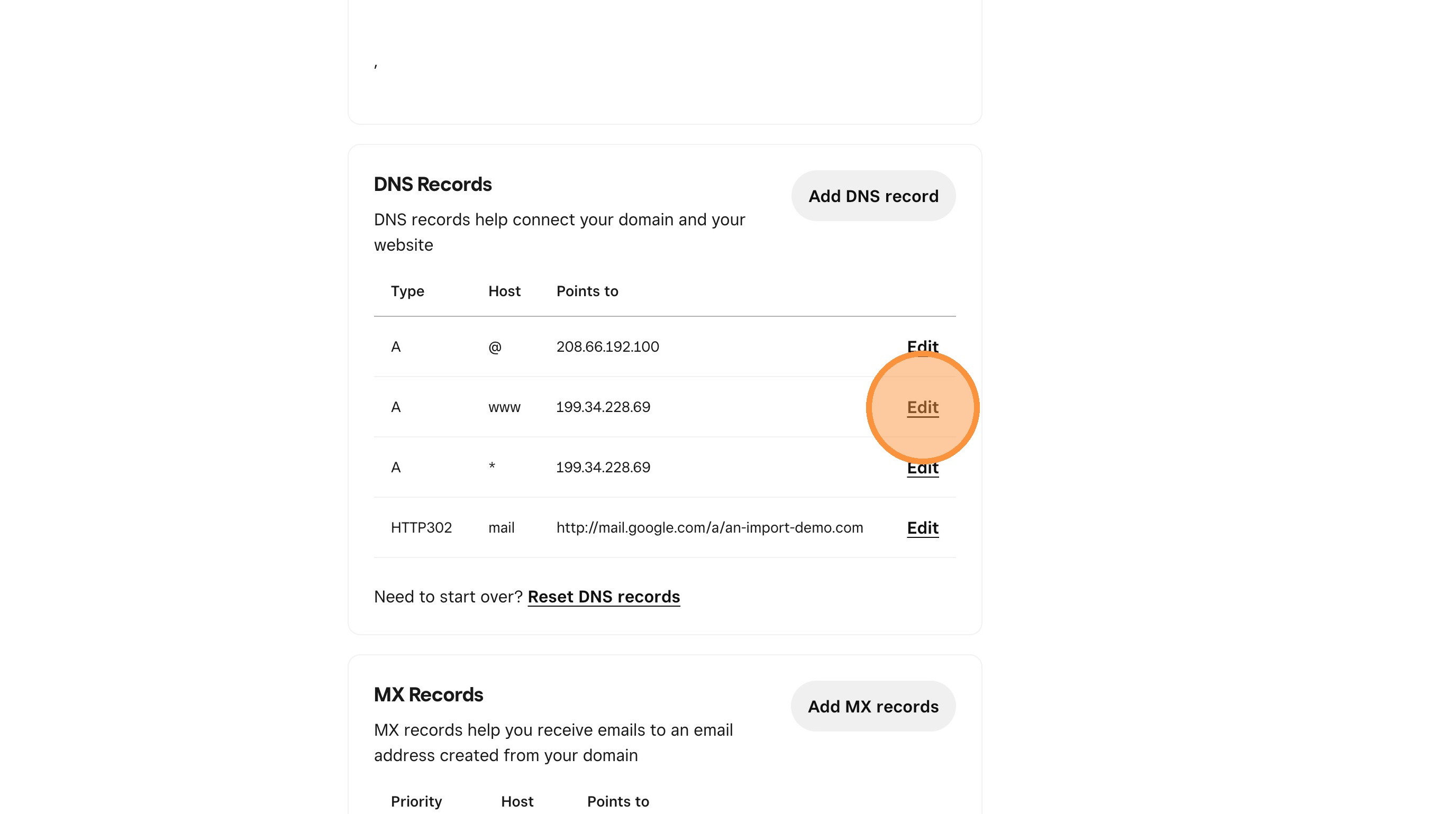 20. Scroll down the DNS Records section and edit the records that point to an ip address