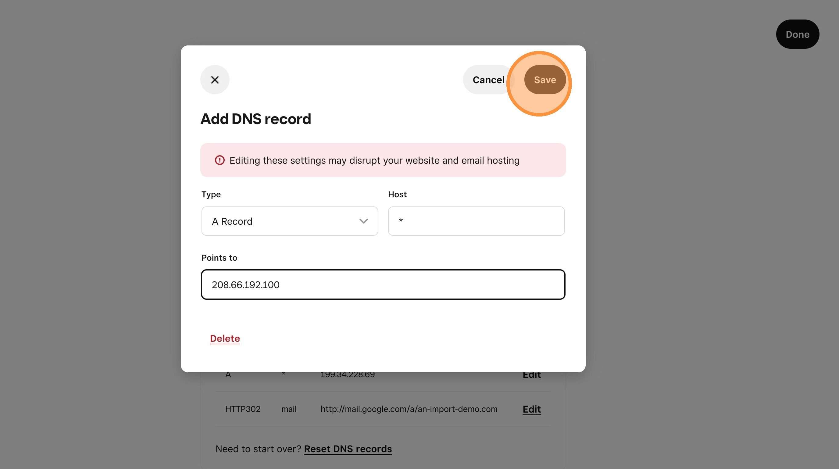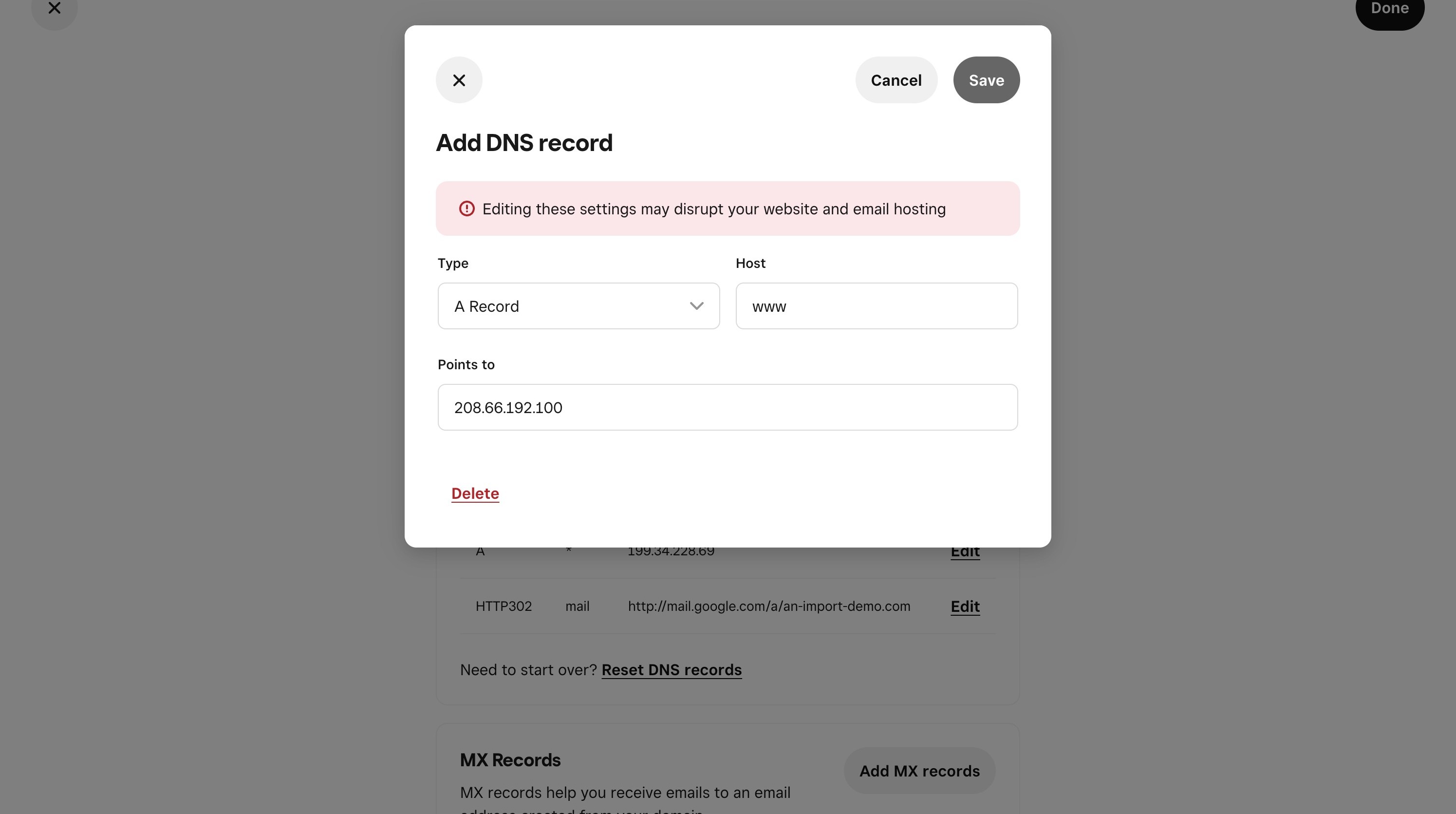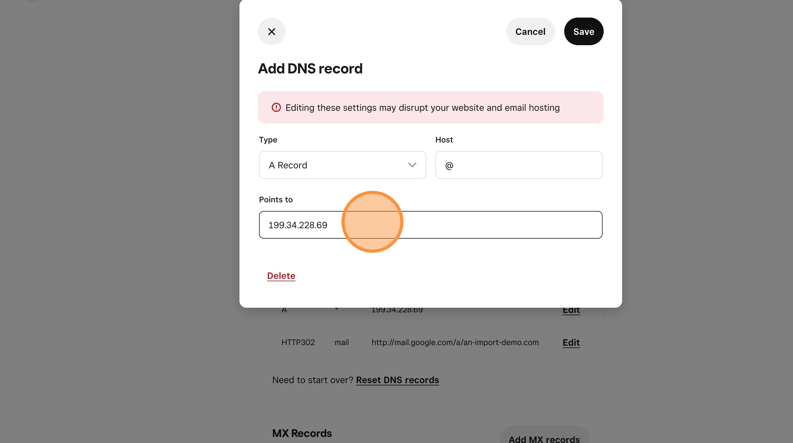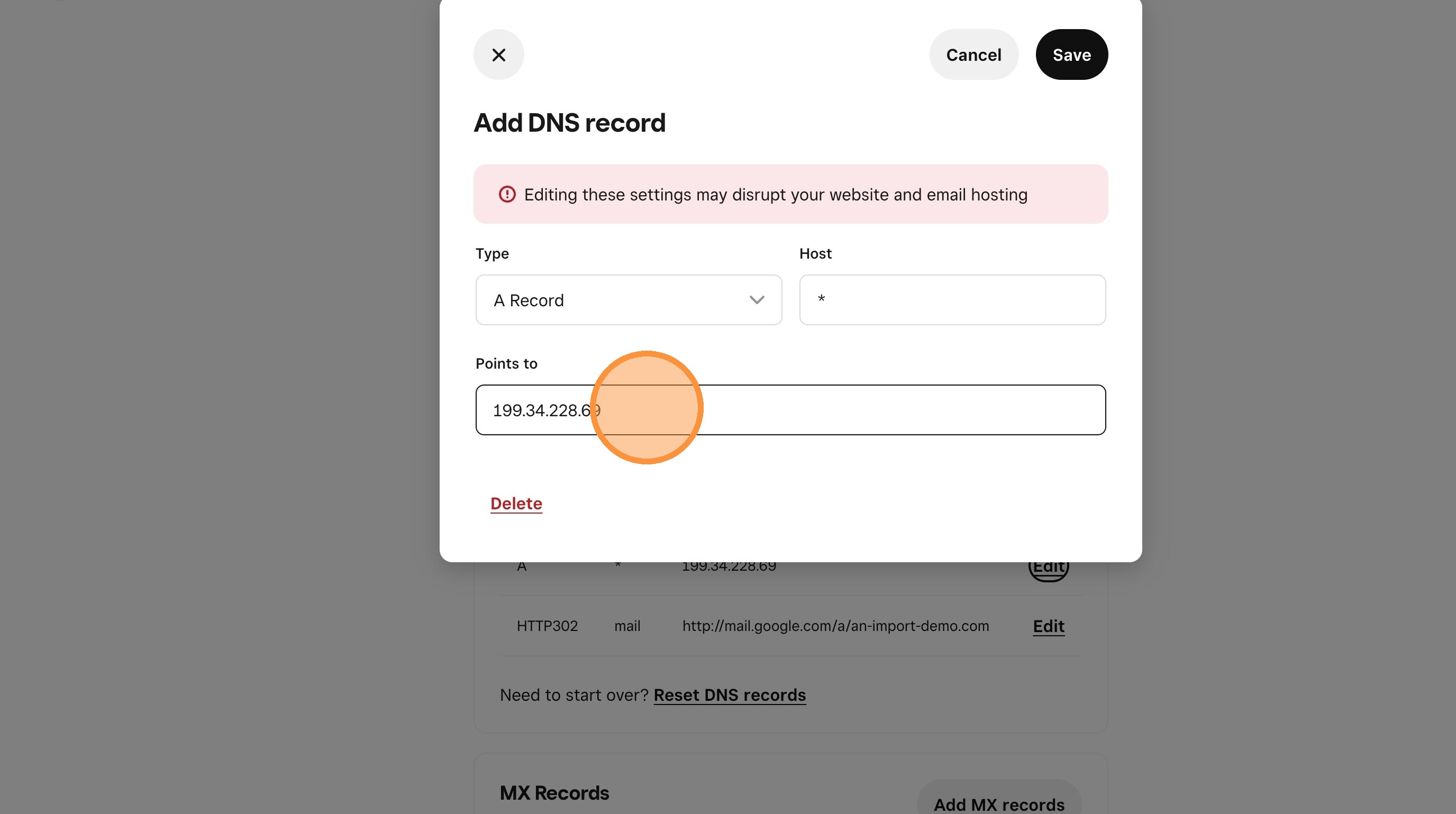 20. Scroll down the DNS Records section and edit the records that point to an ip address