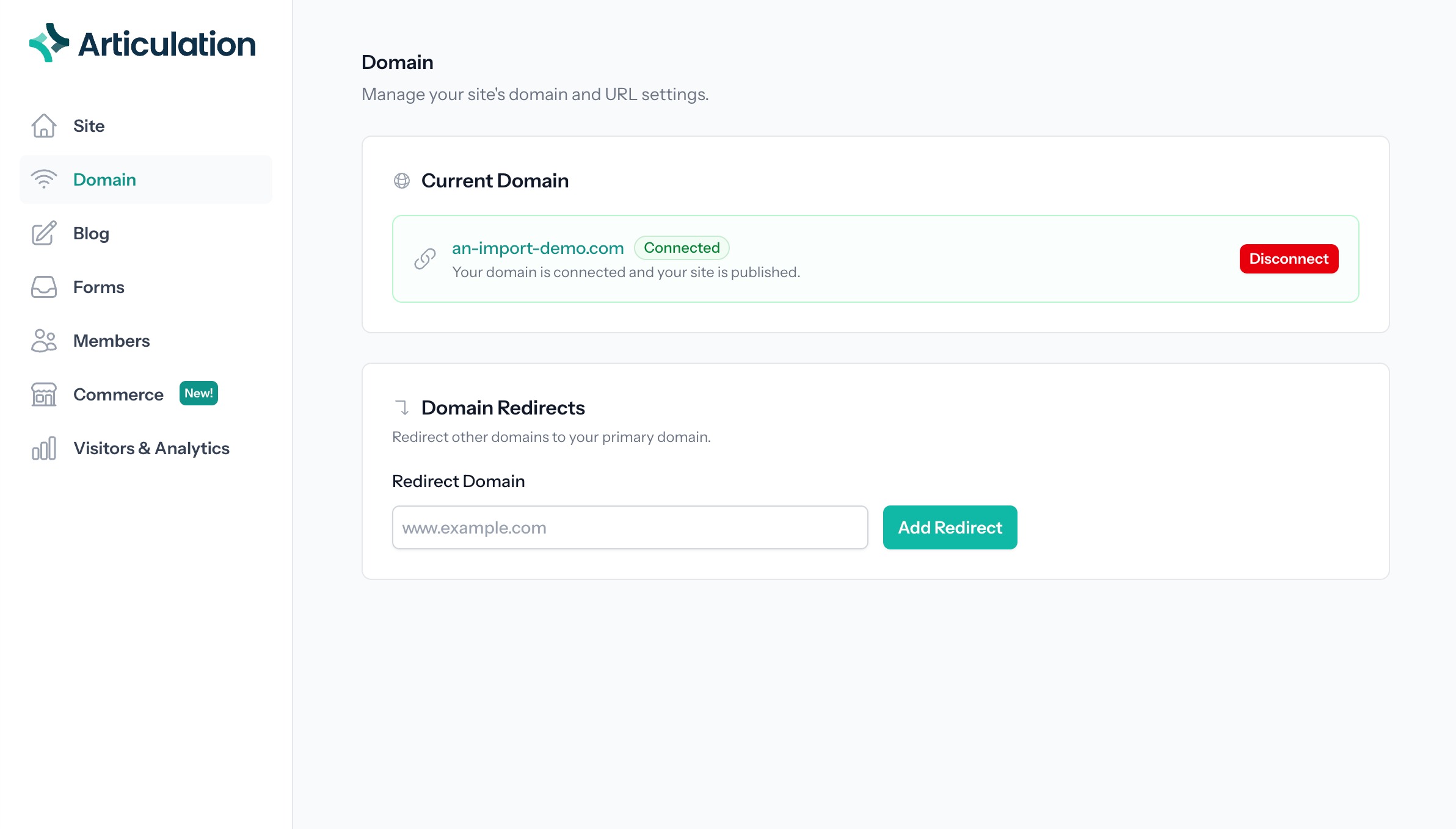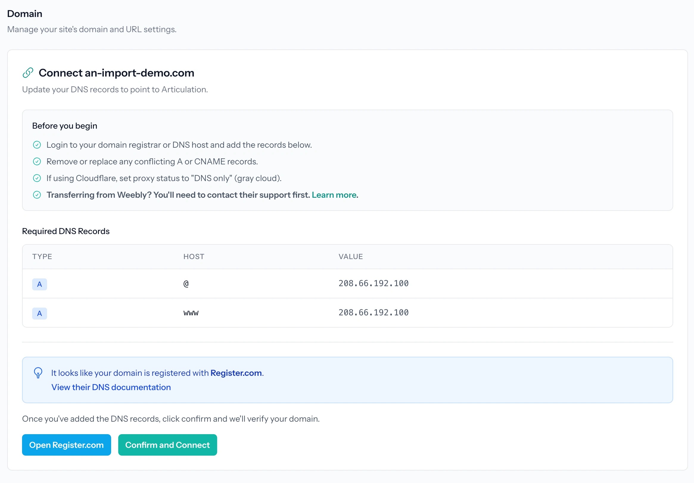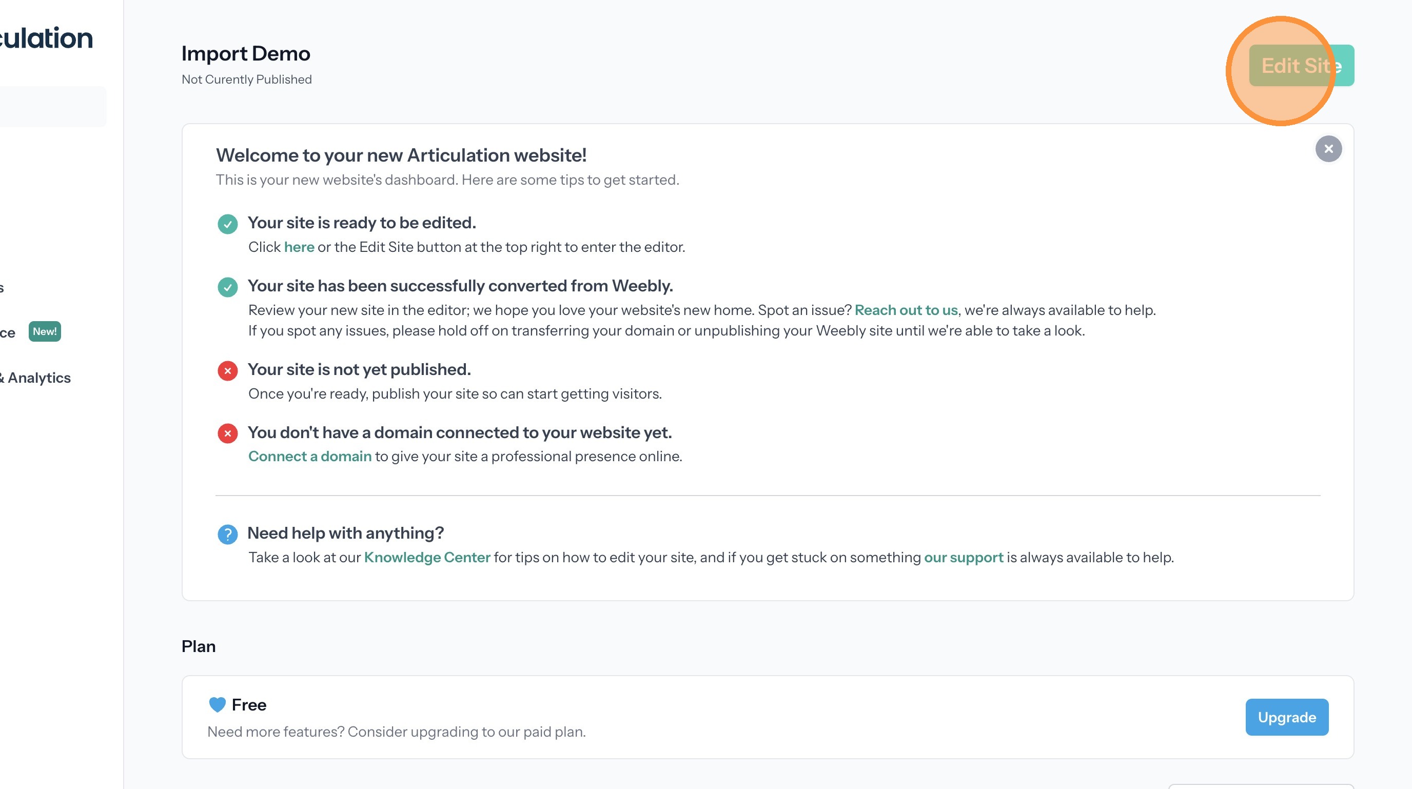 This guide walks through the process for importing your Weebly site to Articulation and connecting a custom domain.